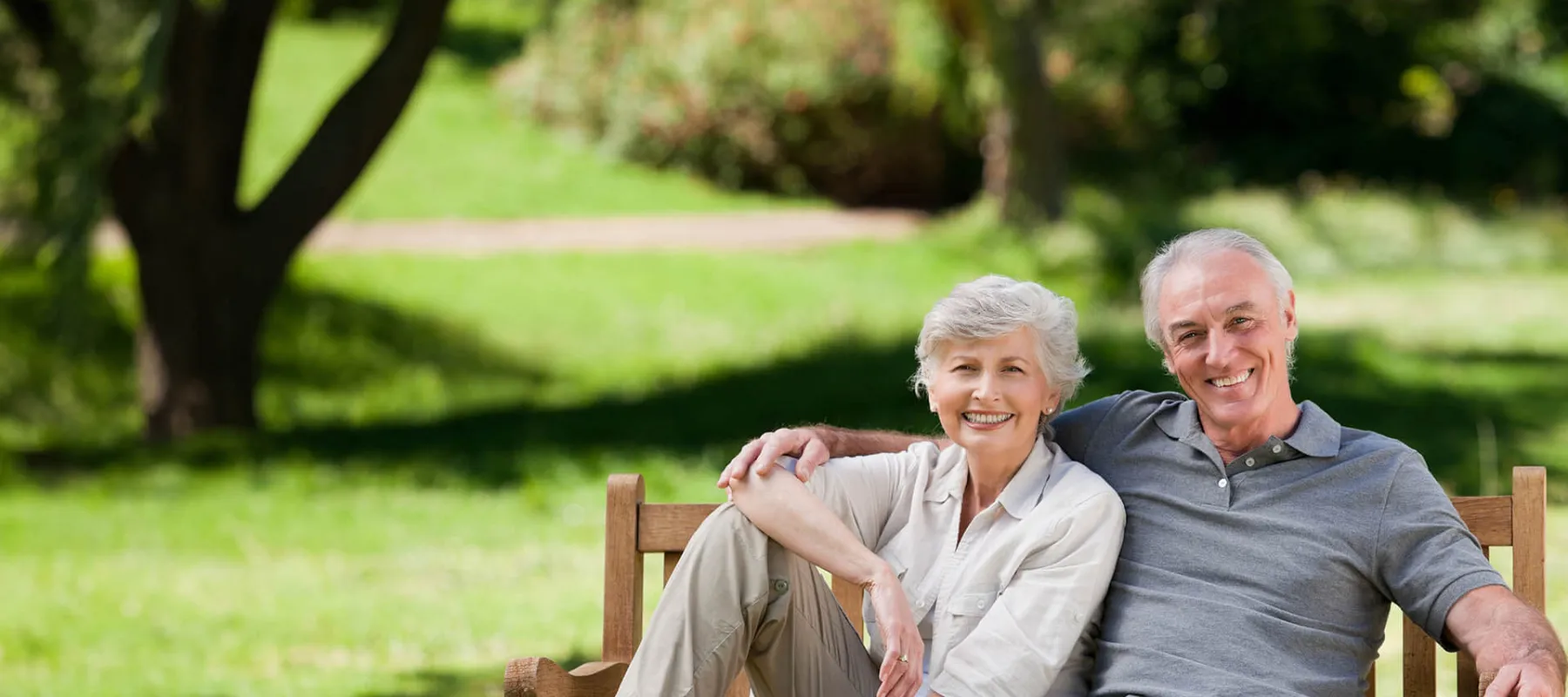 an old man and woman sitting on a bench in a park